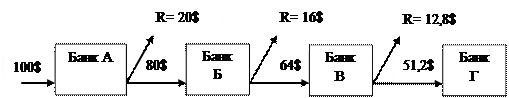 Предположим, что банк А получил вклад наличными в размере 100 долларов. Он предоставил ссуду в размере 80 долларов, оставив 20 долларов в виде резервов. Получатель ссуды расплатился чеком с клиентом банка Б. Следовательно, банк Б получил чек на 80 долларов, он обязан зарезервировать 16 долларов, а 64 доллара предоставляет в ссуду. Общий прирост денежной массы по банкам А и Б составляет 80+64=144 доллара. Данный процесс будет продолжен банками В, Г, Д и т.д. Мультипликативное расширение депозитов продолжается, по закону убывающей геометрической прогрессии до тех пор, пока суммарная величина прироста обязательных резервов не компенсирует первоначальный прирост избыточных резервов.