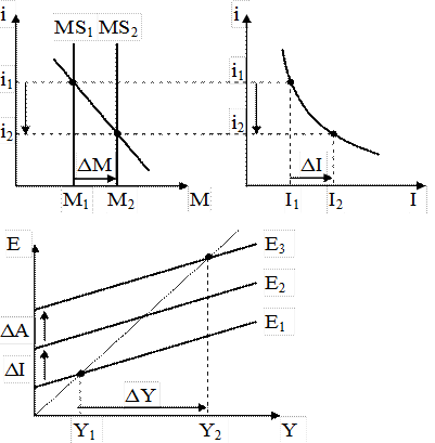 Увеличивая предложение денег, центральный банк снижает ставку процента с i1 до i2, что приводит к росту инвестиций с I1 до I2 увеличивающему совокупные расходы на ΔI и сдвигающему график E1 в положение E2.
