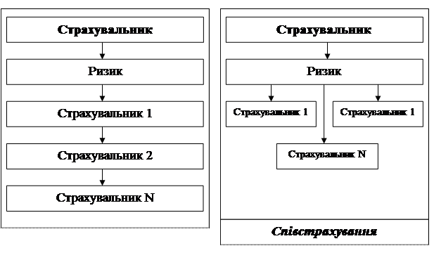 - співстрахування – особливий вид спільної діяльності страховиків, коли одночасно два або кілька страховиків за угодою приймають на страхування великі страхові ризики одного страхувальника з дотриманням принципу пропорційної відповідальності (Рис. 6.2). Кожен з страховиків відповідає за свою частину страхових зобов’язань безпосередньо перед страхувальником.