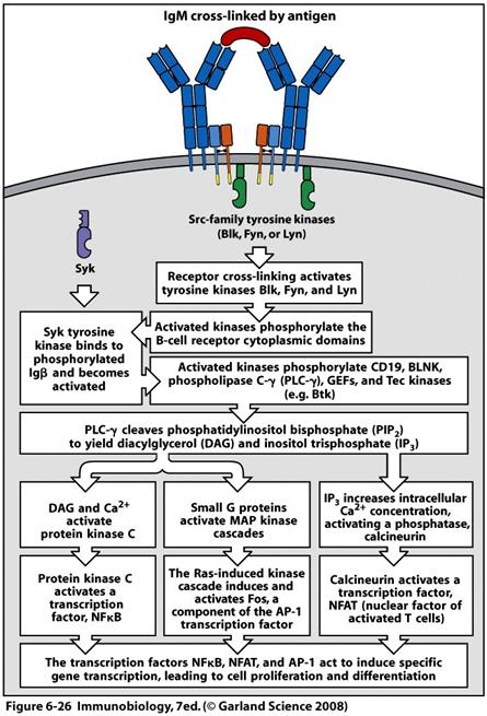 Загальна спрощена схема передачі сигналу від антиген-специфічного рецептору В лімфоцитів