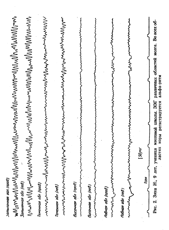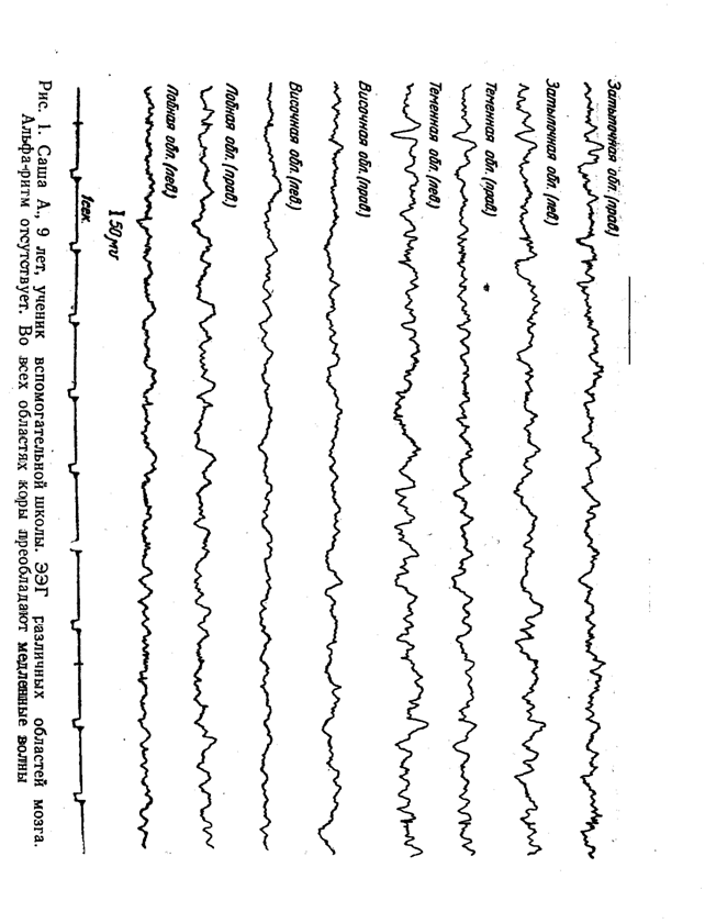 На рис. 2 для сравнения помещена кривая нормально развивающегося ребенка того же возраста. На этой кривой видно, что во всех областях коры регистрируется четко выраженный альфа-ритм.