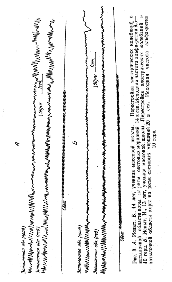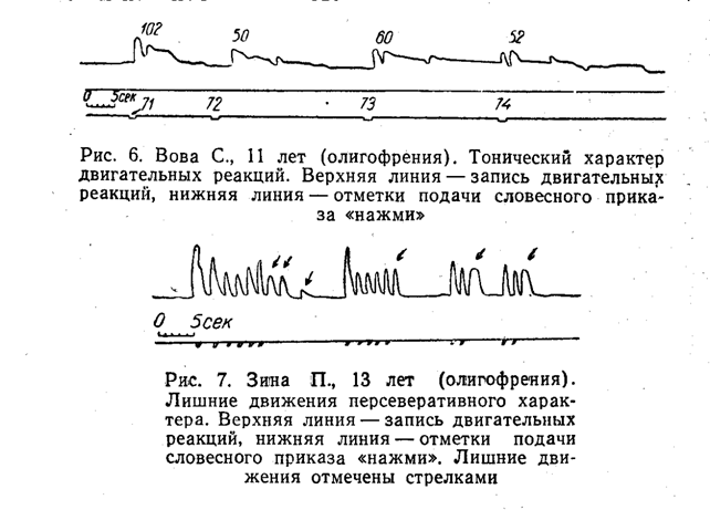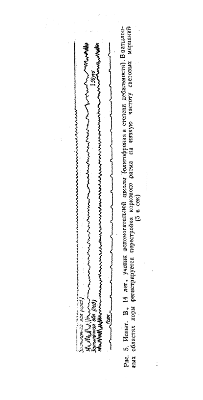 При исследовании наряду с регистрацией электроэнцефалограммы в состоянии покоя применялся метод записи биотоков при ритмическом световом раздражении. Эти исследования, проведенные в электрофизиологической лаборатории Института дефектологии АПН РСФСР Н. Н. Зислиной, показали, что кора нормально развивающегося ребенка усваивает частые ритмы световых мельканий, что свидетельствует о ее высокой функциональной