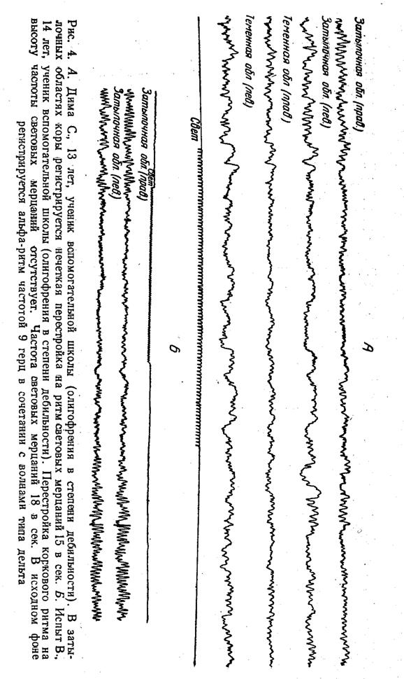 подвижности (рис. 3, А, Б). В то же время у подавляющего большинства детей-олигофренов наблюдалась либо очень нечеткая перестройка корковых ритмов на высокую частоту световых мельканий, либо ее полное отсутствие (рис. 4, А, Б). В отличие от здоровых детей у олигофренов можно было наблюдать настройку на низкие частоты световых мельканий (рис. 5).