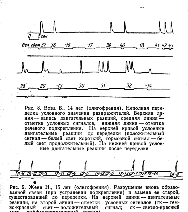 Уже при проверке связей, сложившихся в прошлом опыте детей, наблюдались отклонения от нормы, которые сводились в основном к недостаточной концентрации раздражительного процесса и некоторым проявлениям инертности. Отклонения от нормы выступали особенно отчетливо при образовании новых условных связей, но были неодинаково выражены при выработке простых и сложных систем связей. Простые положительные условно-рефлекторные связи у большинства исследованных детей-олигофренов образуются так же быстро и легко, как и у нормальных детей; у большинства олигофренов в степени дебильности легко вырабатываются и простые дифференцировки. Существенные затруднения наступают у олигофренов при выработке относительно более сложных систем связей, для образования которых ребенку необходимо абстрагировать из совокупности признаков непосредственного условного сигнала какой-нибудь мало выделяющийся признак.