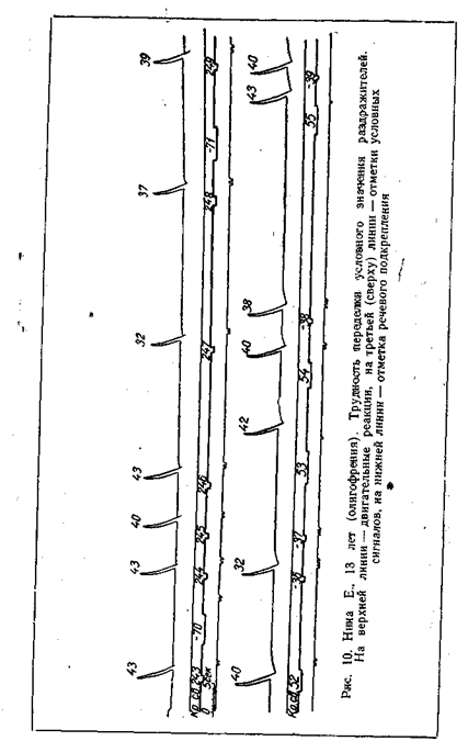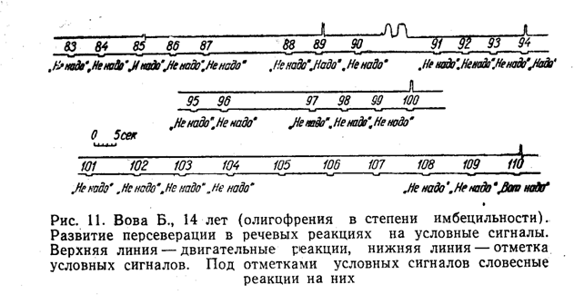 На уровне второй сигнальной системы обнаруживаются: грубая инертность старых словесных связей (в отчетах), персеверации в речевых реакциях, легкость образования словесных стереотипов (отщепляющихся от непосредственных реакций), инертность словесных связей после переделки непосредственных условных реакций. Персеверации в речевых реакциях ярко выступали в тех случаях, когда наряду с двигательными реакциями дети-олигофрены давали на сигналы речевые ответы. В этих речевых ответах и проявлялась инертность. На рис. 11 показано, как при выработке условных реакций через два сигнала на третий наблюдались персеверации слов «не надо», являвшиеся его ответом на тормозной сигнал.