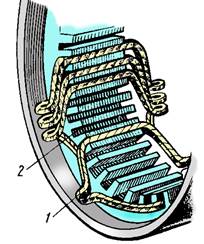 Секции укладывают таким образом, что в каждом пазу размещается или одна или две стороны — одна над другой. В соответствии с этим различают одно- и двухслойные обмотки. Наибольшее распространение получили двухслойные. Их секции 1 (рис. 2) укладывают в пазы 2 статора в два слоя. При этом одна пазовая сторона секции укладывается в нижнем слое (ближе ко дну паза), а вторая – в верхнем. Перед укладкой обмотки стенки паза покрывают листовым