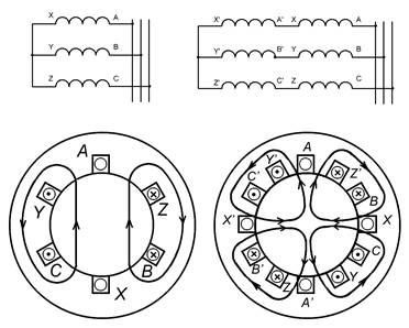 | Рис. 3. Схема соединений обмоток статора и получение двухполюсного и четырехполюсного магнитного поля |