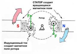определяется направление действия сил на проводники (обозначены F на рис. 5). Под действием пары сил F возникает вращающий момент, направленный в сторону вращения поля статора и ротор начинает вращение. Таким образом, статорный ток вызывает или индуктирует ток ротора, поэтому очень часто асинхронные машины называют индукционными.