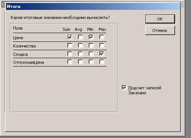 Задается тип вычислений выполняемых для каждого поля: итог, среднее значение, минимум,максимум и подсчет числа записей.
