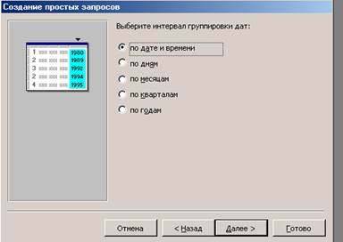 5. Если в поле запросов выбрали числовые поля или поля дат, то в следующем окне необходимо определить способ представления данных: подробный или Итоговый. Если Итоговый, то щёлкнуть кнопку Итоги.