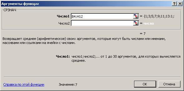 22. Щелкните на кнопке ОК. Теперь в ячейке F14 будет автоматически подсчитываться среднее значение всех чисел прямоугольной области от клетки В4 до клетки Н12. В данной ситуации эта величина равна 7.