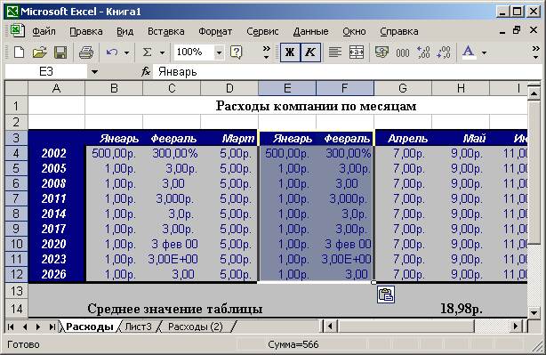 4. Щелкните на ячейке Н14, в которую переместилась ячейка с формулой среднего значения таблицы. В строке формул вы увидите текст =CPЗHAЧ(B4:J12) (=AVERAGE(B4:312)). To есть, область вычисления среднего значения автоматически расширилась на два вставленных столбца. Таким образом, формулы, работающие с массивами данных, автоматически адаптируются при увеличении размера массива.