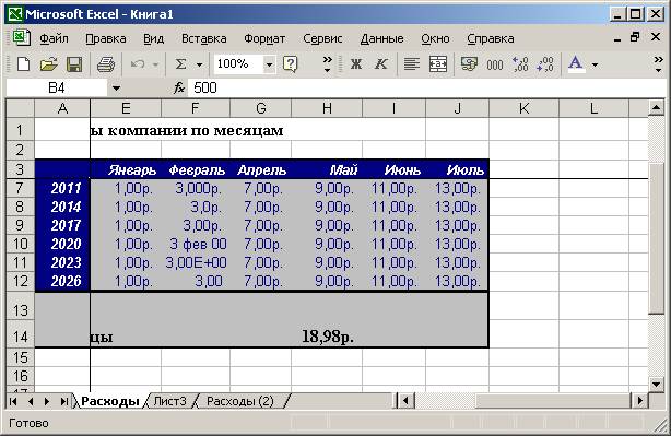 8. Щелкните на ячейке В4. Затем выберите команду Окно ® Закрепить области (Window® Freeze Panes). Ячейки, расположенные выше или левее выделенной, окажутся закрепленными и отгороженными от остальной таблицы тонкими черными линиями.