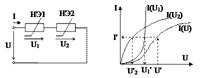 Нелинейные цепи простой конфигурации удобно рассчитывать графическим методом. Рассмотрим графический метод расчета нелинейных цепей с последовательным и параллельным соединением нелинейных элементов.
