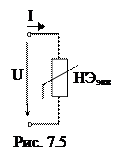 Эти два элемента можно заменить одним эквивалентным (рис. 7.5) с вольт-амперной характеристикой I(U), построенной на рис. 7.4, б. Для построения этой характеристики, задаваясь значениями тока, суммируют значения напряжений U1 и U2 на нелинейных элементах в соответствии со вторым законом Кирхгофа. Полученная характеристика I(U) позволяет определить ток I' цепи для любого заданного значения входного напряжения U', а по значению этого тока определить напряжения на НЭ U1' и U2' по вольтамперным характеристикам этих элементов.
