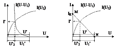 На рис. 7.6, а построены характеристики I(U2) и I(U-U1), абсциссы которых получены вычитанием абсцисс вольт-амперной характеристики I(U1) из напряжения U при различных значениях тока.
