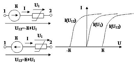 При последовательном соединении с нелинейным элементом источника постоянной ЭДС (рис. 7.7, а), ВАХ всей цепи получается путем смещения характеристики НЭ I(U1) влево или вправо в зависимости от полярности источника (рис. 7.7, б). При этом положительное направление для напряжений выбирают совпадающим с положительным направлением тока.