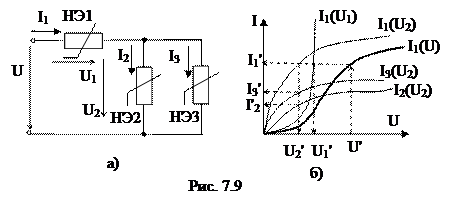Смешанное соединение НЭ. На рис. 7.9, а показана схема смешанного соединения НЭ. Графическое построение для определения токов и напряжений приведено на рис. 7.9, б.