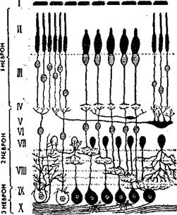 Рис. 2. Схема строения сетчатки глаза человека. Обозначения: I — пигмеи-тальный слой; II—слой палочек и колбочек; III — наружный ядерный слой; IV—наружный сетчатый слой; V — слой горизонтальных клеток; VI—слой биполярных клеток (внутренний ядерный); VII — слой амакриновых (однополюсных грушевидных) клеток; VIII — внутренний сетчатый слой; IX — слой ганглиозных клеток;. X — слой волокон зрительного.нерва,