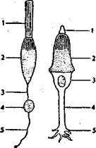 Рис. 3. Строение палочки и колбочки сетчатки глаза. А — палочка: 1 — наружный членик; 2 — внутренний членик; 3 — волокно; 4 — ядро; 5 — конечная пуговка. Б — колбочка: 1 — наружный членик; 2 — внутренний членик; 3 — ядро; 4 — волокно; 5 — ножка.