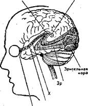 рецепторные концы наружных нервных клеток. Светочувствительные элементы — колбочки и палочки различны по своим функциям и по своим взаимосвязям с элементами нейросетчатки и центральными клетками головного мозга. В целом они образуют компактную нервную ткань. Итак, зрительный анализатор является сложной сенсорной системой, воспринимающей и анализирующей световые раздражения. Возникающий в рецепторах сложный фотохимический процесс способствует трансформации световой энергии в нервное возбуждение, передающееся через проводящие пути от сетчатки через ядра таламуса и гипоталамуса в кору мозга (рис4), где происходит анализ и синтез зрительных ощущений и восприятий и осуществляются связи органа зрения