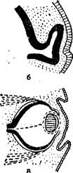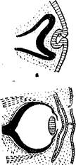 Возникающая задняя стенка глаза смыкается вокруг волокон зрительного нерва таким образом, что кажется, будто этот последний, врастая в глазное яблоко, прободает его заднюю стенку. Тем временем на том участке эктодермы (наружный листок), к которому приближается растущий глазной бокал, происходит поразительное изменение: эктодерма утолщается, ее клетки.размножаются и углубляются навстречу глазному бокалу. Углубившийся участок эктодермы отшнуровывается от ее слоя, принимает вид двояковыпуклого тельца, клетки его, теряя свои ядра, становятся прозрачными, и возникающий таким образом хрусталик занимает свое место внутри глазного бокала. Зачаток глаза, получивший начало от эктодермы, обрастает мезодермальной