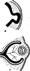 Рис. 5. Схема эмбрионального развития человеческого глаза, а — е — последовательные стадии развития: черным обозначена нервная эктодерма, дающая начало нервной ткани; заштрихована наружная эктодерма; точками обозначена