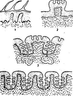 Рис. 16. Вкусовые сосочки языка. 1 — нитевидные; 2 — грибовидные; 3 — желобоватые; 4 — листовидные.