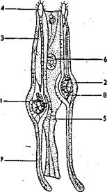 Рис. 19. Строение обонятельного эпителия: 1 и 2 тело обонятельных клеток; 3 — наружный членик; 4 — булавовидное утолщение наружного членика; 5 — опорная клетка; 6 — ее ядро; 7 — центральный отросток обонятельной клетки; 8 — цитоплазма.