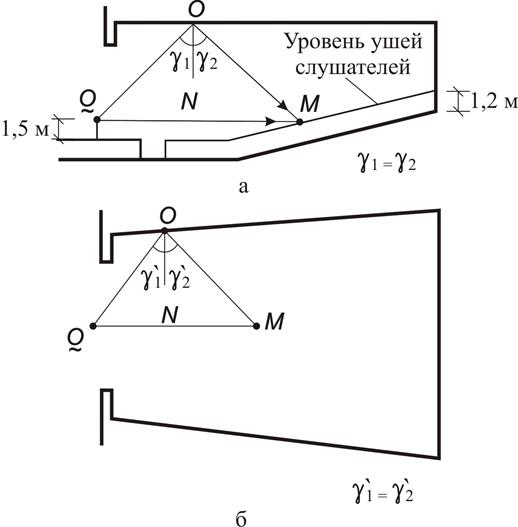 Обычно строят геометрические отражения в вертикальной плоскости по оси симметрии зала, в горизонтальной – на уровне источника звука. На рис. 6.1 приведен пример построения лучевого эскиза. Высота источника над полом эстрады или сцены принимается равной 1,5 м, а высота точки приема над полом – 1,2 м (уровень уха сидящего зрителя).