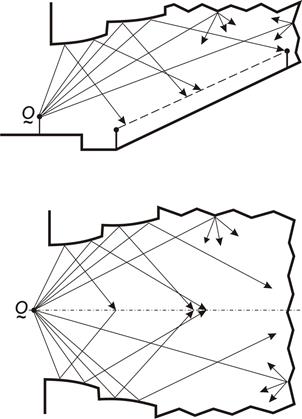 Чаще всего принимается компромиссное решение. В зале обеспечивается сравнительно небольшое время реверберации, а его внутренние поверхности формируются таким образом, чтобы часть из них направляла к слушателям интенсивные малозапаздывающие отражения, увеличивая ясность звучания, в то время как другая часть создавала рассеянное отражение звука, повышающее диффузность звукового поля. Это достигается при помощи различной степени расчленения отдельных поверхностей зала (рис. 10.8).