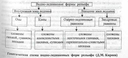 Водно-ледниковые формы рельефа образуются при таянии льда и формируются водными потоками. Характерным для водно-ледниковых отложений является их перемытость, относительная бедность минеральными веществами и сортированность в зависимости от скорости потоков.