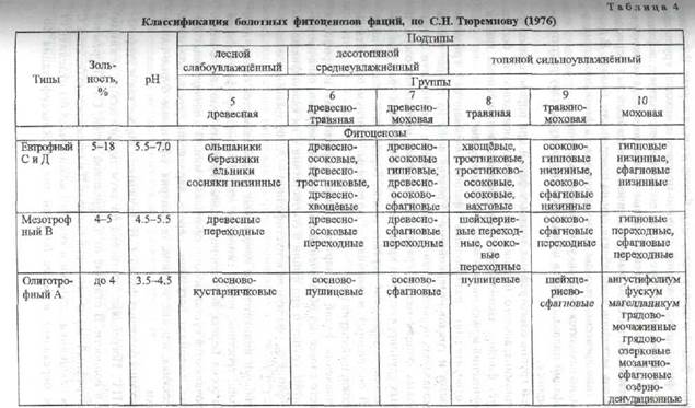 Болотные фации группируются по двум экологическимрежимам – трофности и водности (табл. 4). По трофности они подразделяются на три типа: олиготрофный, мезотрофный и евтрофный; по степени оводненности – на три подтипа: лесной, лесотопяной и топяной. С увеличением водности главная роль в фитоценозах фаций переходит от древесных к травяным растениям и затем – к мхам.