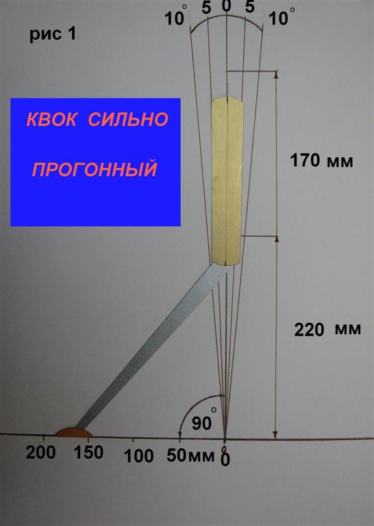 Квок с большим наклоном вперед имеет некоторые преимущества в том случае, если рыбак привык стучать не перед собой, или на против корпуса, а только позади себя. Понятнее выражаясь, за спиной. Мне доводилось видеть квоки с большим наклоном. Конкретный рыбак, изготовивший такое «творение» после длительных тренировок подчиняет этой технике группу собственных мышц, и весьма успешно ловит сома. Но тому, кто не готов к длительным тренировкам, лучше избегать подобных моделей. Максимальный угол, который можно допустить при изготовлении квока, не более 10 градусов в каждую сторону. Все что превышает, потребует индивидуального мастерства при освоении техники удара подобным инструментом.