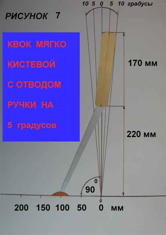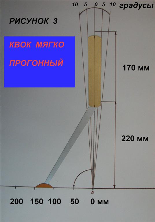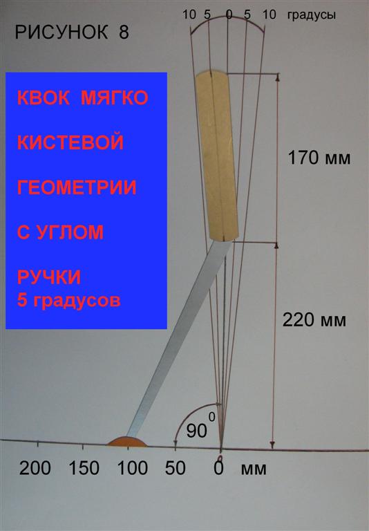 Рисунок демонстрирует технологическое решение, при котором отклонение ручки всего на 5 градусов позволяет разгрузить кисть и сохранить силы в начальной стадии удара. Обычно, это помогает рыбакам, существенного возраста, кто не имеет возможности выполнить требуемый поворот кисти. При отклонении ручки изменяется угол входа пятачка, и звук получается более устойчивым. Особо отмечу, этот прием срабатывает не во всех случаях. Зависит от посадки квочника в лодке.