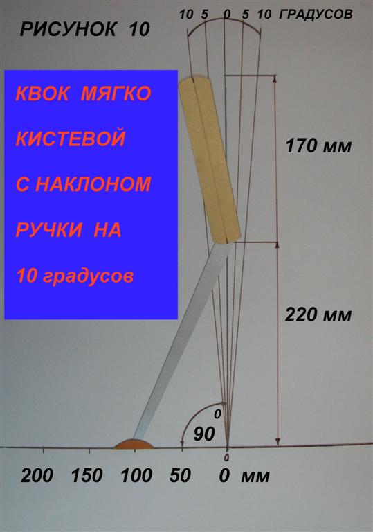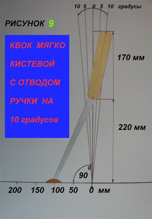 Изготавливая именные наборы квоков, я пришел к выводу, что удовлетворить удобство по наклону ручки для заказчика заочно, не представляется возможным. В одних случаях квочник первую половину рыбалки стучит с наклоном туловища вперед, вторую с отклонением туловища назад. Кроме прочего, усталость и наличие волны вызывают поиск новой позиции для удара. После ряда экспериментов, я пришел к выводу, что фасонная ручка может устроить многих квочников и сократить число фальшивых ударов. На рисунке 11 видно что рукоятка такого фасона, имеет сектор отклонений в разные стороны. Она очень удобна для работы с высокого борта. При изготовлении квока самостоятельно, лучшим вариантом является ручка, не имеющая отклонений от оси вертикали квока.