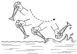 Погрузив копытце на 5-8 см косым ударом спереди - назад, его извлекают из воды, сохраняя прежнее направление движения и скорость. Вначале у рыболова получается очень много брызг. «Музыкальную школу» можно считать успешно законченной, если при квочении уже не бывает брызг (рис. 2).