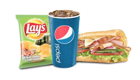 Один из 5 сабов 15см / 30см, салат или ролл + напиток Pepsi 0,4л + чипсы Lays 35гр.