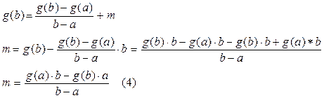 Шаг 1. Проводим прямую (хорду) между точками с координатами (a, Y(a)) и (b, Y(b)). Выведем уравнение этой прямой g=k∙x + m: