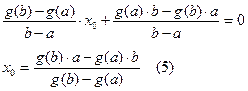 Теперь, определив коэффициенты уравнения прямой k m можно вычислить точку пересечения хорды с осью абсцисс x0, в которой g(x0)=0: