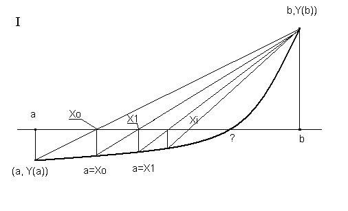 Если же, как на рис.8, Y(а) и Y(x0) имеют разные знаки, то есть Y(а)∙Y(x0) < 0, то дальше следует рассматривать промежуток [a, x0]. Следующую хорду надо провести между точками (a, Y(a)) и (x0, Y(x0)). Точку b переносим в x0.
