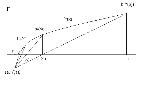 Выбор точки а или b, из которой следует строить следующую хорду, можно также осуществить с помощью знака второй производной Y”(x). Если знак Y(b) и Y’’(b) совпадают (Y(b)∙Y’’(b) > 0, то хорды следует строить из точки b (рис 8. случай II), в противном случае из точки а (рис.7, случай I).