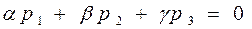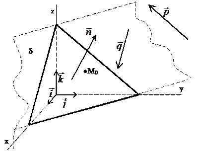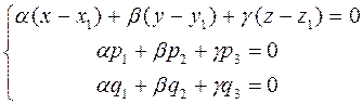 Система уравнений (10)является системой линейных одноородных уравнений относительно неизвестных координат вектора нормали плоскости δ. Она имеет ненулевое решение, если определитель системы равен нулю. Таким образом, для плоскости, проходящей через точку М0 параллелно векторам