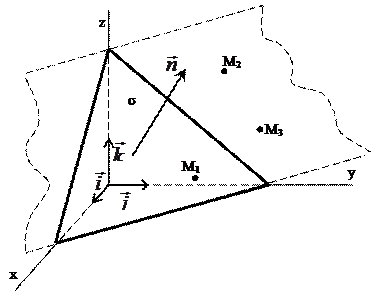 Соотношение (12) это уравнение относительно неизвестных x, y и z, которые являются координатами любой точки М(x;у;z) плоскости σ, его называют уравнением плоскости, проходящей через три точки.