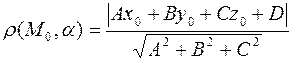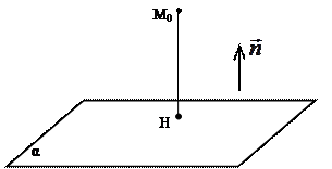 Пусть в прямоугольной системе координат задана плоскость α: Ах+Ву+Сz+D=0 и т. М0(x0; y0; z0), не лежащая в этой плоскости. Вычислим расстояние от точки Мо до плоскости α. Заметим,что