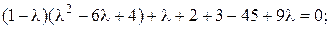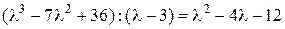 Чтобы решить это уравнение, поступим следующим образом. Методом подбора найдём один из корней уравнения λ1, которым может быть один из делителей свободного члена. Нетрудно убедиться в том, что λ1 = 3 есть корень уравнения. Это значит, что левая часть уравнения делится без остатка на разность (λ − 3), т. е.