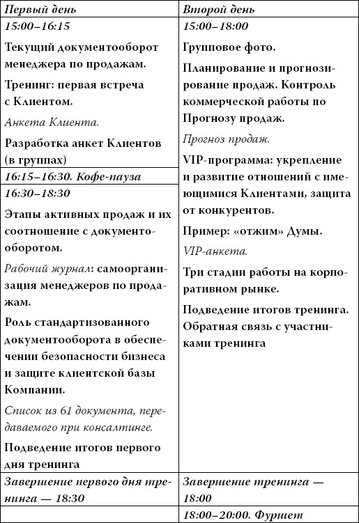 Основную часть тренинга занимают жесткие переговорные рубки, под видео и в малых группах, и разбор полетов. Прорабатываются только наиболее сложные этапы переговоров: переговоры о цене, «дожим» сделок, защита от доминирования Клиента, борьба с «завтраками», «отжим» от конкурентов. Плюс к этому углубленно анализируется специфика работы с крупными корпоративными заказчиками.