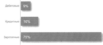 Зарплатные проекты до сих пор остаются одним из главных каналов продаж банковских карточек в России и составляют в среднем по рынку не менее 75—80% от общего объема их эмиссии (рис.1).