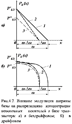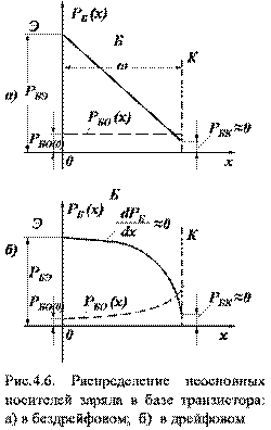 . На рис.4.6 показано стационарное распределение дырок в базе бездрейфового и дрейфового транзисторов.