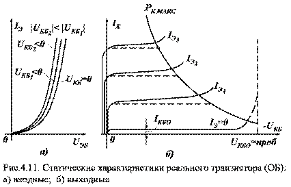 (характеристики идут выше, рис 4.11,а). Другое проявление объемного сопротивления базы заключается в том, что каждая из кривых входного семейства идет положе идеальной (рис.4.10,а) опять же за счет уменьшения напряжения на эмиттерном переходе.